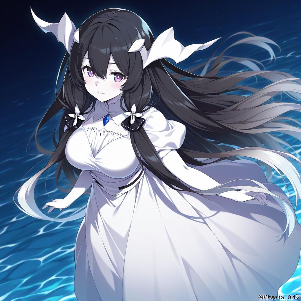 Digital illustration of an anime girl with very long black and white gradient hair, pale skin, and purple eyes. She is wearing a flowing white dress with floral and horn accessories in her hair. The background features a dark, water-like setting with light reflections.