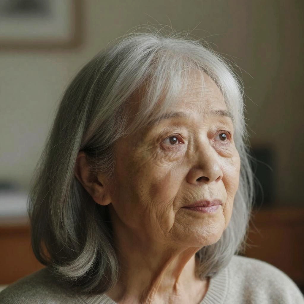 Close-up photograph of an elderly Asian man with wrinkled skin, gray hair, and gentle expression, softly lit by natural light.