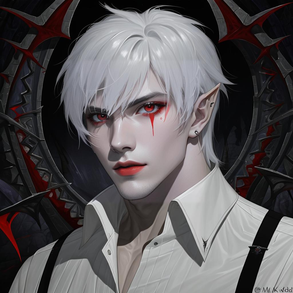 Astarion, baldur's gate, 1boy, red eyes, short hair, white hair, grey hair, white shirt, vampire, elf, by artist limgae, leet
