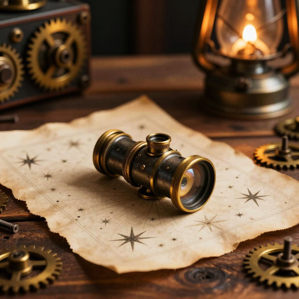 Antique eyepiece resting on an old wooden table, surrounded by scattered parchment star charts, warm ambient light from a lantern, steampunk style with brass gears and screws, cozy and nostalgic atmosphere