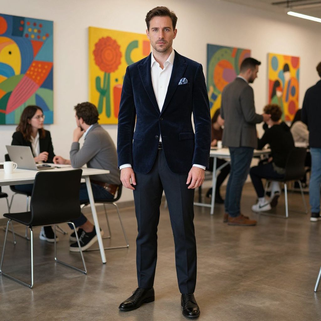 A man, navy velvet blazer, crisp white dress shirt, charcoal dress pants, black leather dress shoes, silk pocket square, standing in a sleek co-working space, vibrant art on walls, networking event in progress, cinecolor style, confident expression. Man has masculine face and piercing eyes