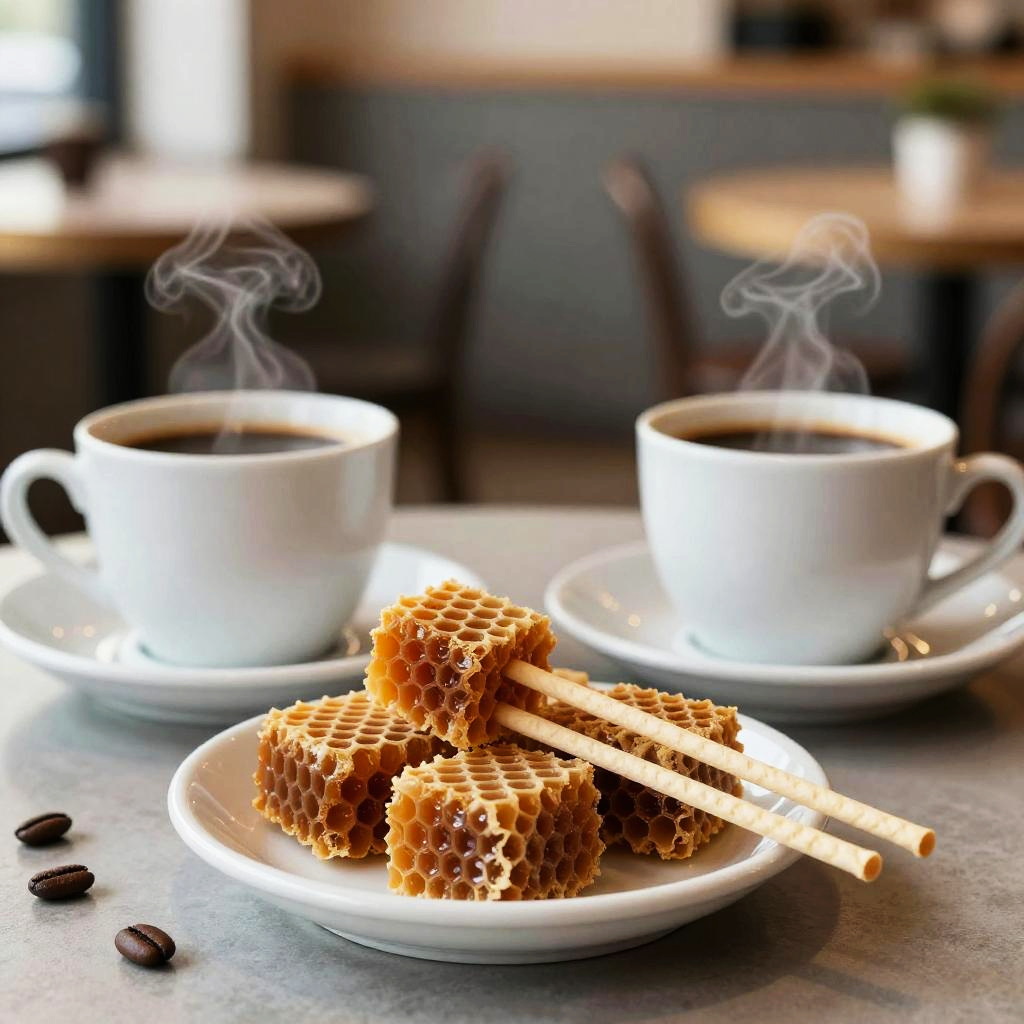 Edible coffee stirrers carved from honeycomb toffee, resting on saucers next to mugs of black coffee, with subtle steam rising and a minimalist café interior in the background.