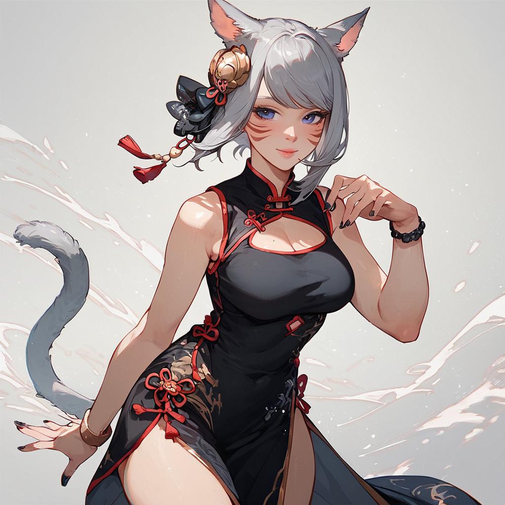 Source_anime, score_9, score_8_up, score_7_up, score_6_up, score_5_up, score_4_up, y'shtola rhul, final fantasy xiv, 1girl, solo, looking at viewer, smile, short hair, hair ornament, dress, animal ears, jewelry, medium breasts, tail, grey hair, cowboy shot, sleeveless, cat ears, nail polish, black dress, bracelet, cat tail, grey eyes, clothing cutout, sleeveless dress, facial mark, chinese clothes, cleavage cutout, brooch, china dress, whisker markings