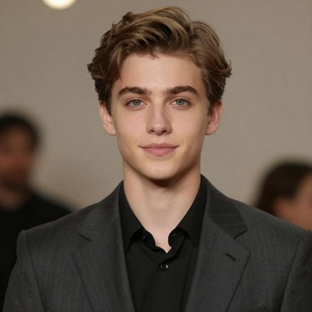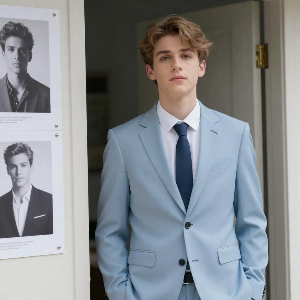 Young man with light brown hair, wearing a light blue suit, white shirt, and tie, stands in a doorway. Poster with black and white images on left. Soft light from right. Casual, slightly upward gaze.