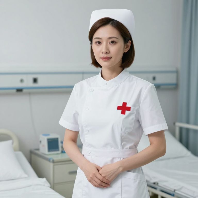 Photograph of an Asian female nurse with short brown hair, wearing a white uniform and cap, standing in a bright, sterile hospital room.
