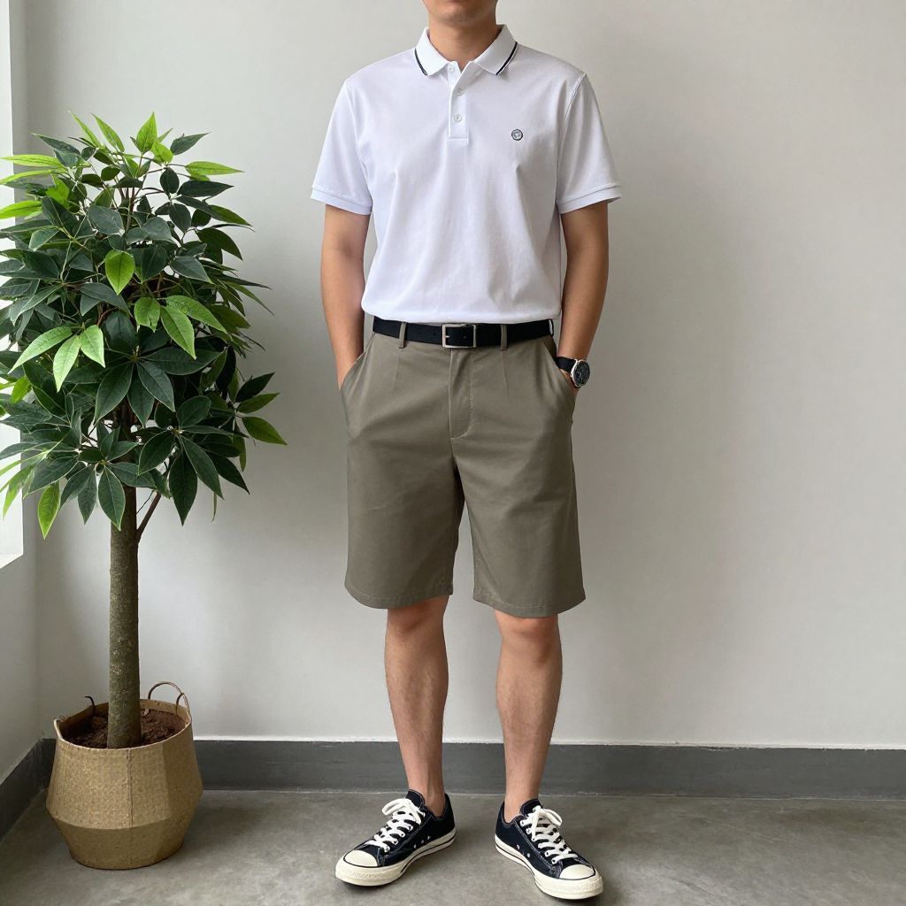 Photograph of a standing man with an Asian appearance, wearing a white polo shirt with a small black logo on the left chest, gray knee-length shorts, a black belt, and black and white sneakers. His hands are in his pockets. He is positioned against a plain white wall with a potted green plant to his left. The floor is gray concrete, and the plant is in a brown woven pot. The image has a clean, minimalist style.
