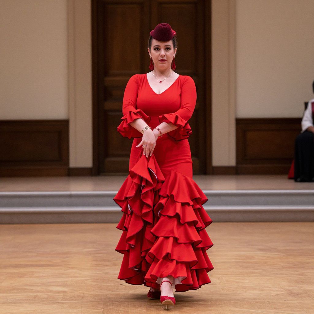 Photograph of a woman with fair skin and dark hair in an updo, wearing a vibrant red, ruffled, long-sleeve dress that flares out in multiple layers. She has red earrings and a necklace, and stands poised on a wooden stage, hands gracefully positioned in front. She wears red pointed-toe shoes with a small heel. The background features a dark wooden door and beige walls, with another person partially visible in a black outfit to the right. The image has a focused, slightly dramatic lighting, highlighting the subject's confident presence.