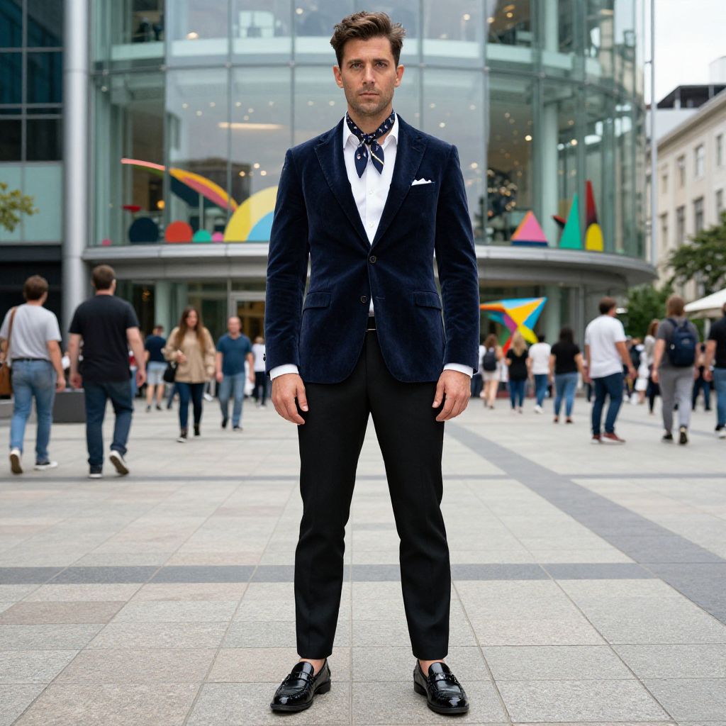 A man, navy velvet blazer, crisp white dress shirt, patterned silk ascot tie, tailored black dress trousers, polished leather loafers, modern glass façade, bustling public plaza, vibrant art installations, eastman film stock, confident expression Man has masculine face and piercing eyes