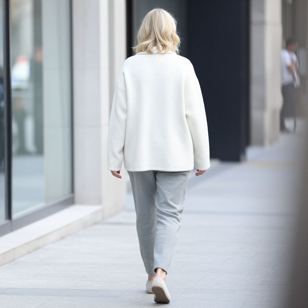 Photograph of a blonde woman with wavy hair, wearing a white blazer, gray pants, and white flats, walking down a sunlit urban