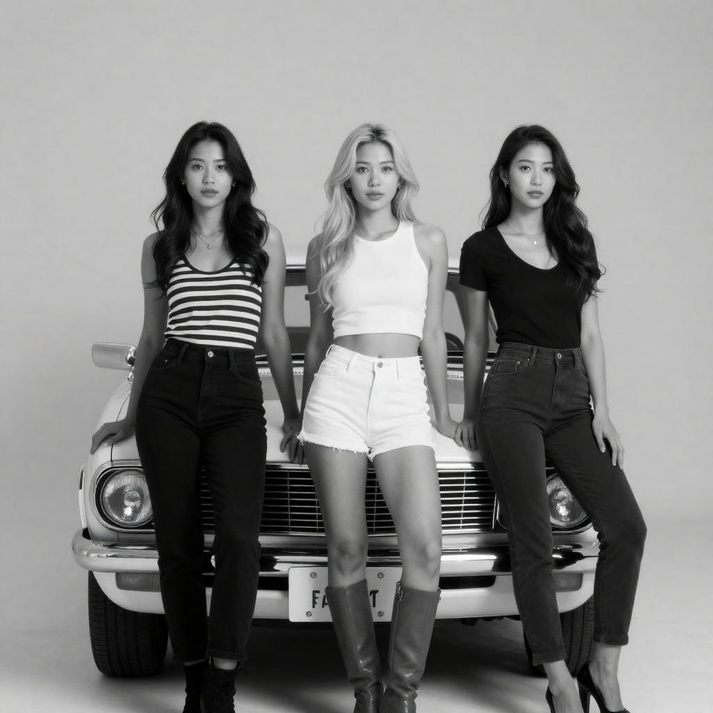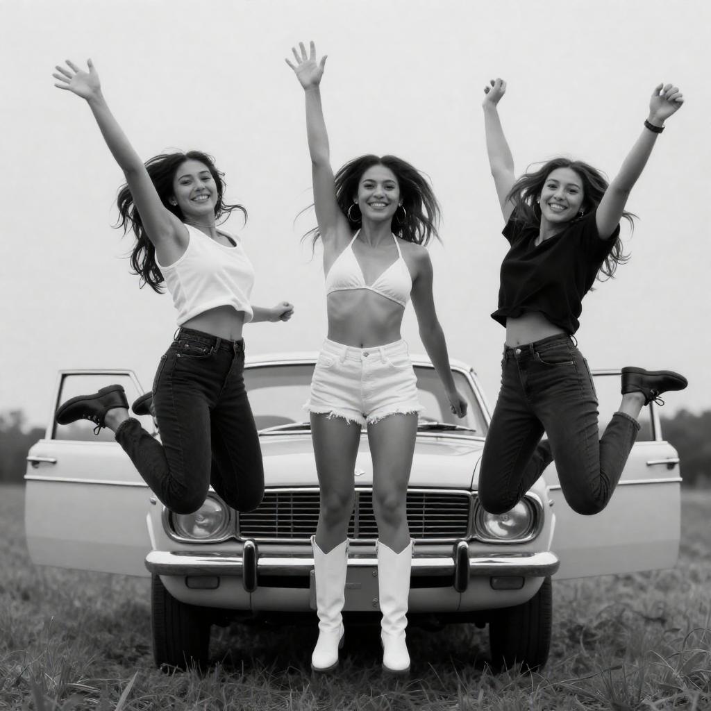 Black-and-white photograph of three women jumping joyfully in front of a vintage car on a grassy field. The woman on the left wears a white crop top and black pants, the center woman wears a white bikini top and shorts with white boots, and the right woman wears a black top and pants. All have long hair and are mid-air with arms raised.