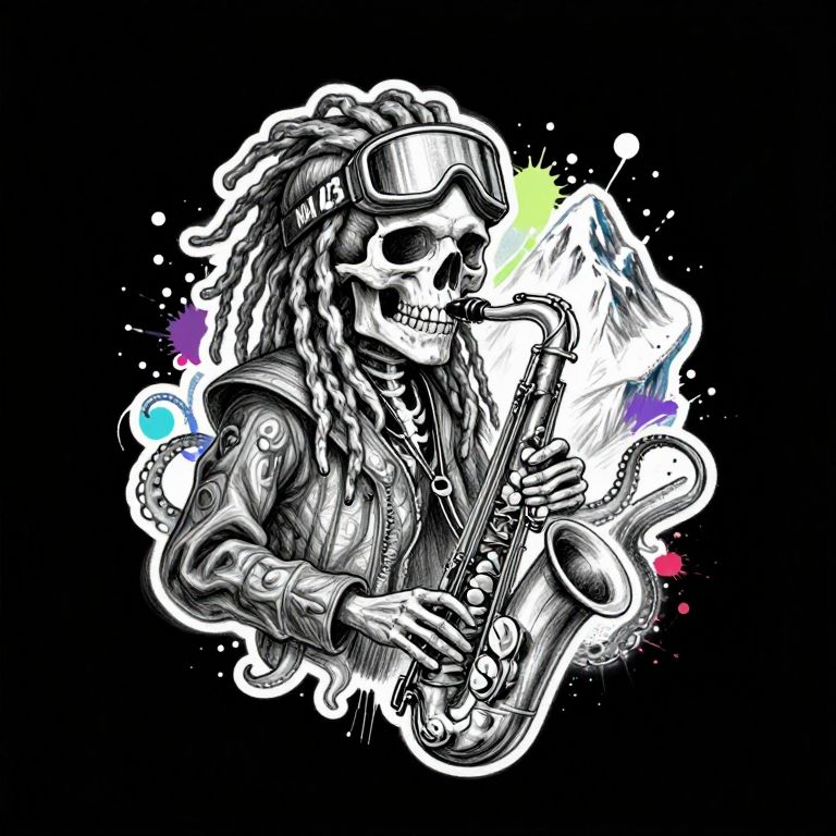 Create a detailed pencil sketch logo of skull, ink and pen, isolated on black background, ink drops, paint splatter, colorful that combines the following elements into a cohesive and harmonious design, perfect for a tattoo, The sketch should feature a realistic skull with dreadlocks, wearing snow goggles with 'NAI23' written on them, The skull is playing a saxophone, and in the background, there is a snowy mountain, The design should have a balanced visual focus between the octopus and the mountain, and the overall composition should be vertical