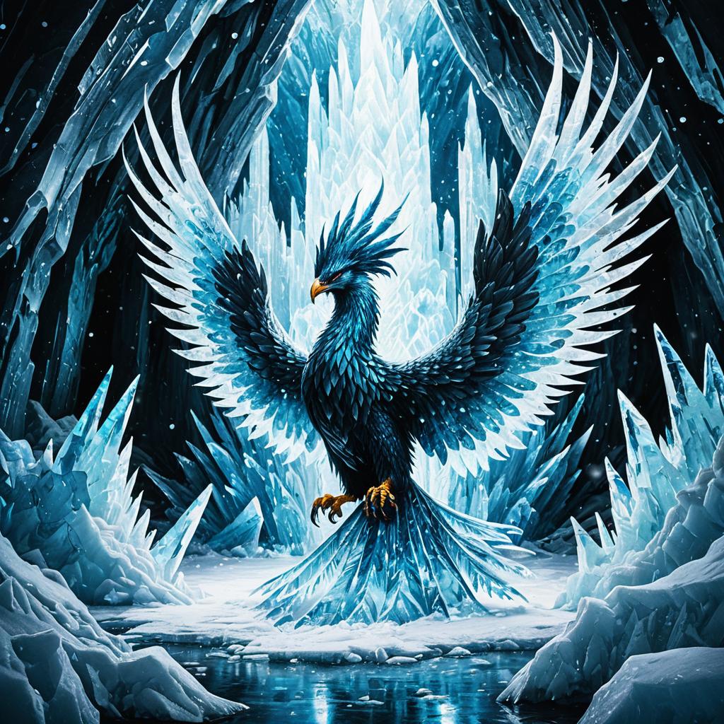 Ice painting of icebound phoenix hatchling in tall icy cliffs, with vibrant cold tones and atmospheric frosty highlights.