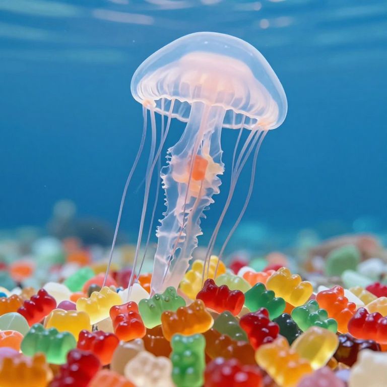 Giant, translucent jellyfish float serenely above a vibrant mound of colorful gummy bears, their ethereal forms contrasting against the bright, candy-coated landscape beneath a clear blue sky.