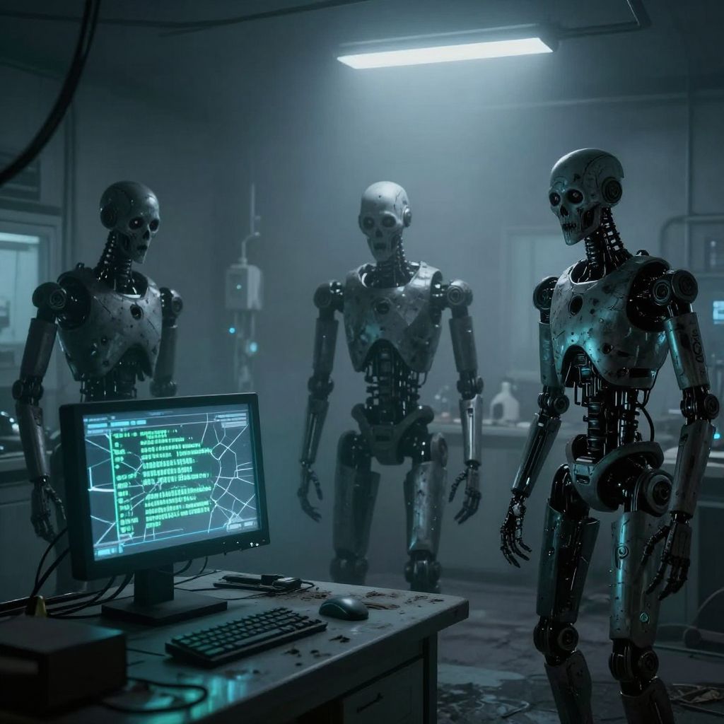 Scary AI prompts depicting haunted androids in a foggy abandoned lab, cracked screens showing cryptic messages, unsettling atmosphere, moody shadows