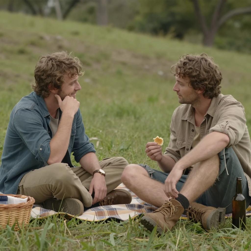 Indoor scene of two men with short brown hair, one wearing a striped shirt and the other a beige shirt, sitting closely and petting a black cat with a red collar on a green table. The room has dim lighting with shelves and boxes in the background, creating a cozy atmosphere.