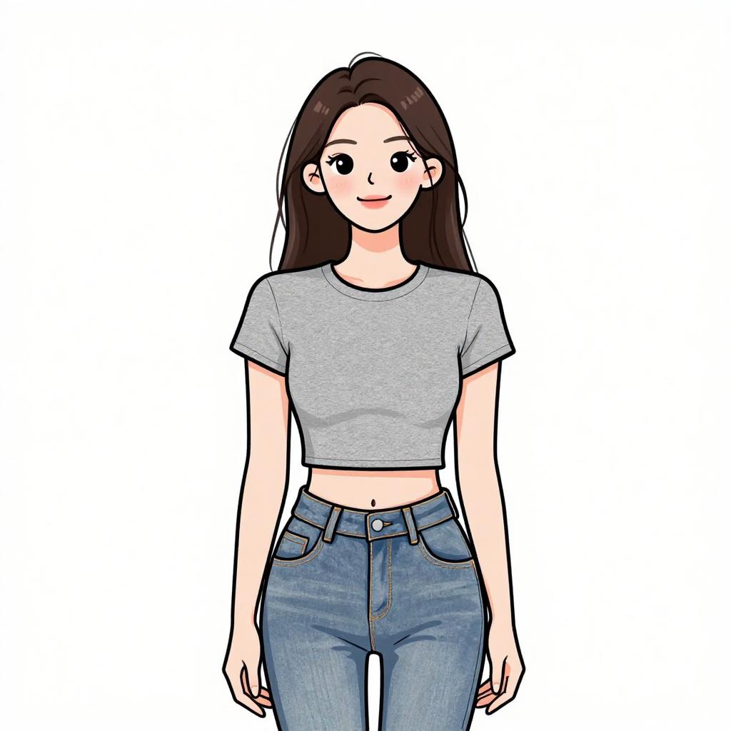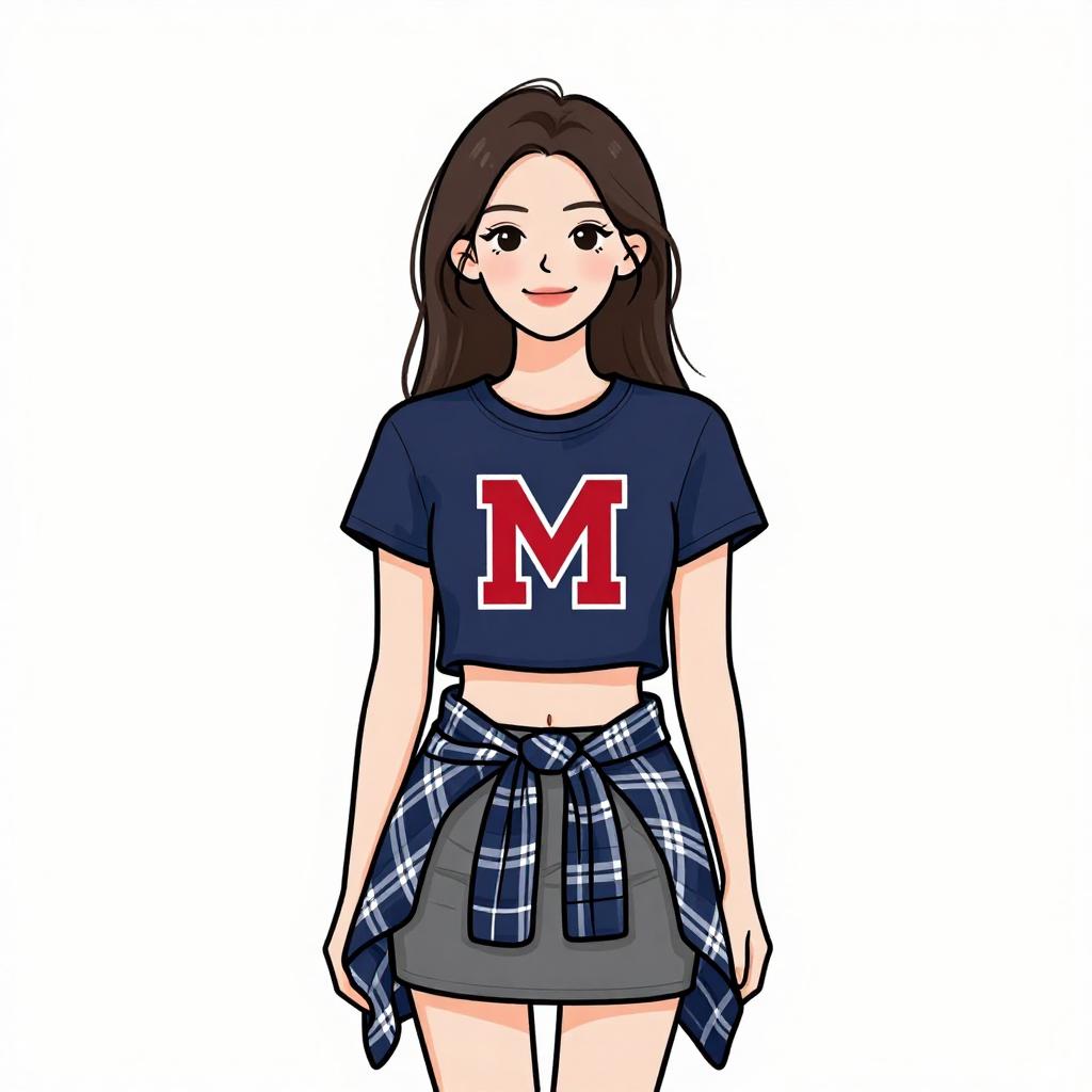 Woman with pretty face and pretty hair. smiling Woman, casual, navy blue cropped T-shirt with a red letter 'M' print, round neckline, short sleeves, grey mini skirt, plaid shirt in shades of blue and white tied around the waist, visible midriff --sref 1467