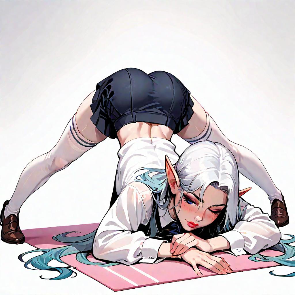 Score_8_up, score_7_up, score_6_up, best quality, masterpiece, uncensored, by ke-ta, source_animerating_explicit, elf, jack-o' pose, white tshirt, thighhighs, skirt