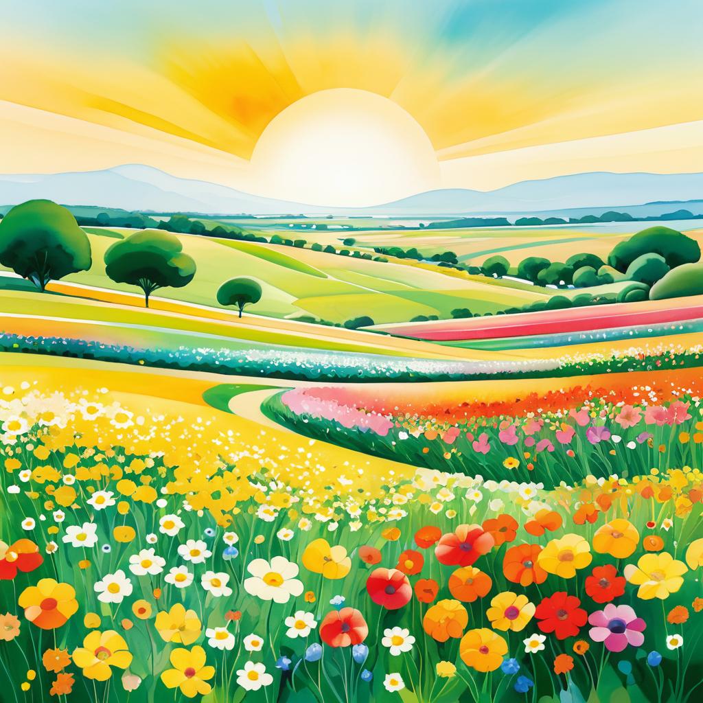 Detailed illustration of vibrant flower fields in summer with colorful blooming flowers including daisies and poppies. The scene depicts a serene landscape with gently rolling hills, trees, and a bright sky with soft clouds, inspired by the style of Georgia O'Keeffe.