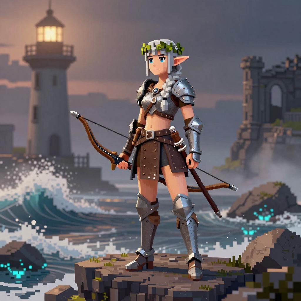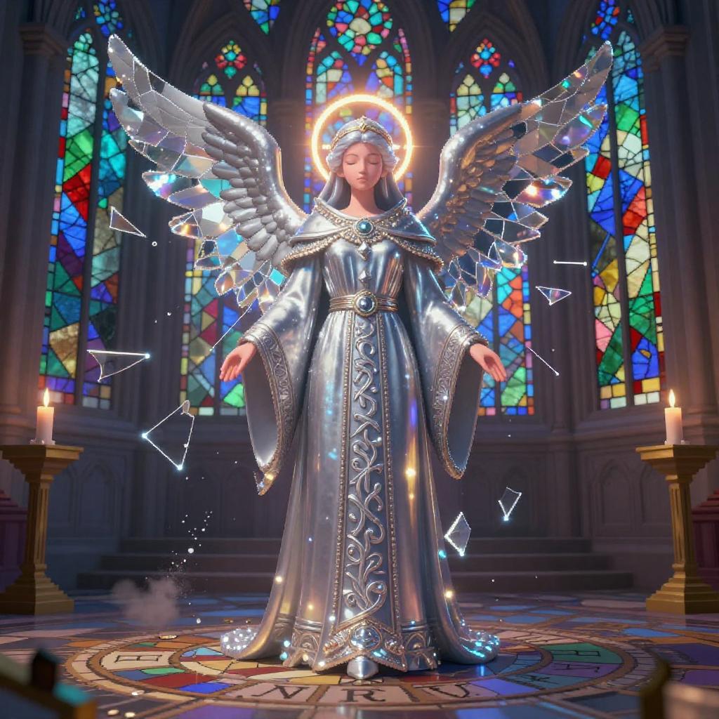 ((dithering)), limited palette, 16bit, pixel art, best quality, masterpiece, ethereal angelic cleric with glowing halo and silver robes, intricate embroidery, full body, in cathedral of fractured stained glass at aurora-lit night, shattered colored panes casting refracted beams, candlelit altars, mosaic rune floor, drifting motes of dust and suspended glowing script, rendered in pixel art fused with stained-glass mosaic low-poly 3D, luminous glass refractions and colored rim lighting, high-contrast limited palette, polished crystalline highlights and soft cel-shading, realistic materials, polished metal, subsurface scattering, specular highlights, cinematic depth of field, soft blurry background, dramatic rim light, retro RPG cover energy, crisp silhouette, high focus character