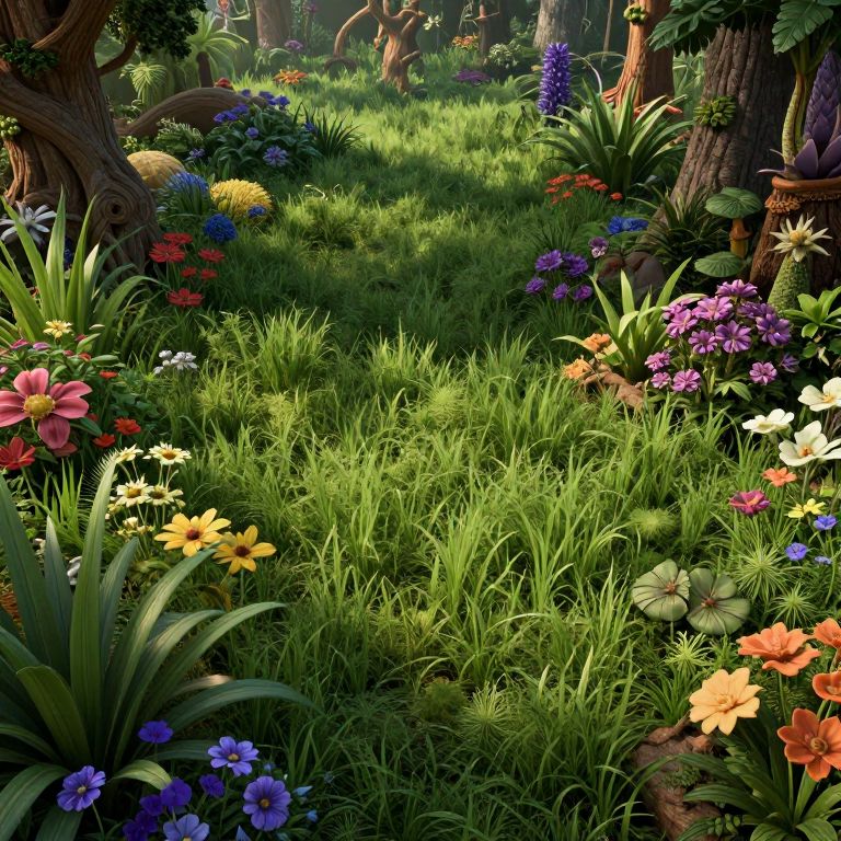A highly detailed, photorealistic 3D rendering of a magical, intricate nature scene with long green grass, colorful flowers, and a complex ecosystem, created using Unreal Engine with cinematic lighting and smooth rendering.