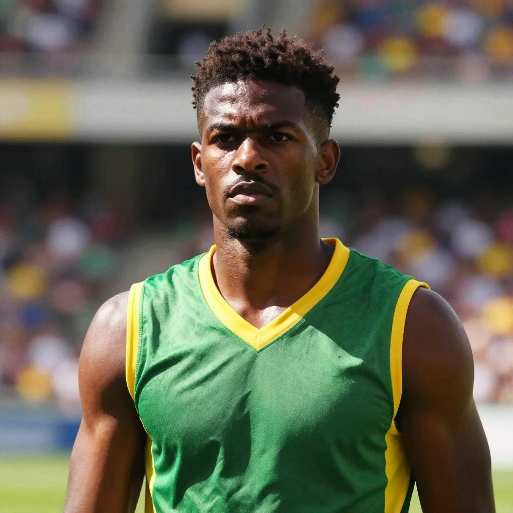 Photograph of a serious-looking, muscular black male athlete with short, curly black hair, wearing a green and yellow jersey. He's standing in a brightly lit stadium filled with blurry spectators in the background. The sunlight creates a dramatic, glowing effect on his face and shoulders. His expression is focused and determined. The image has a vibrant, high-contrast style.