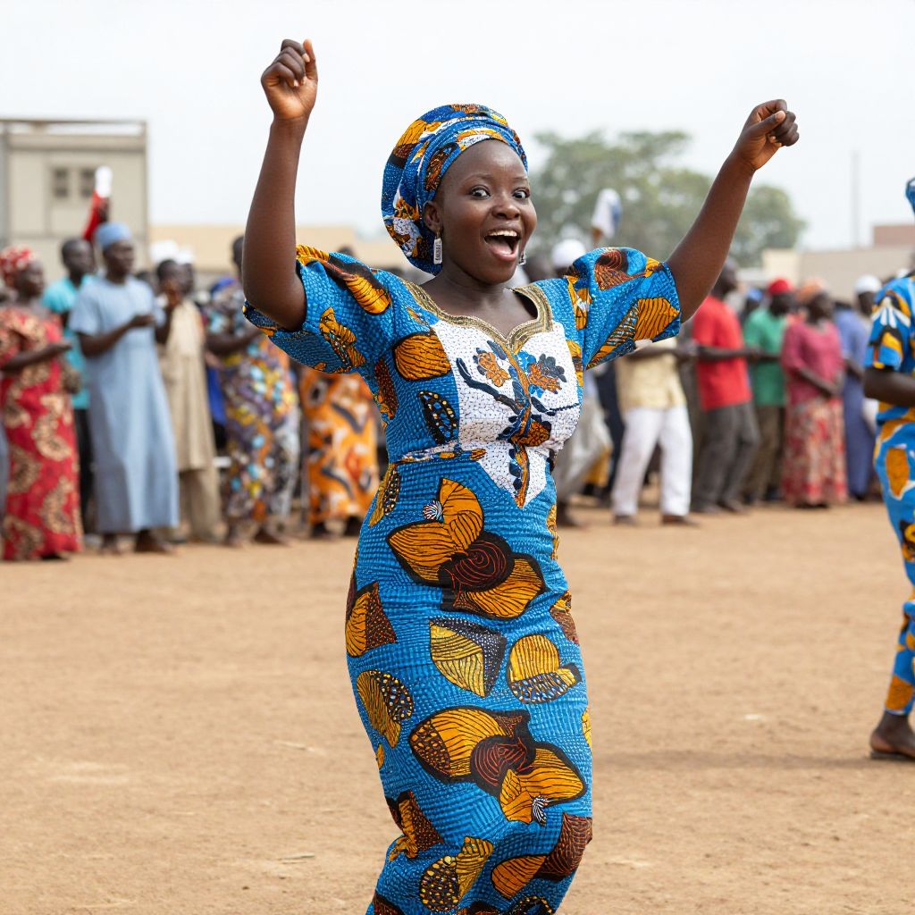 A Senegalese boubou woman celebrating during a festival in a large open field, her flowing colorful elegance radiating pride and joy, her face glowing with excitement, eyes wide and bright, arms raised in celebration, traditional patterns pulsing with movement, crowd in the background, festive music faintly heard, high-resolution realistic photographic style capturing cultural authenticity.. The woman has big tits and cute face