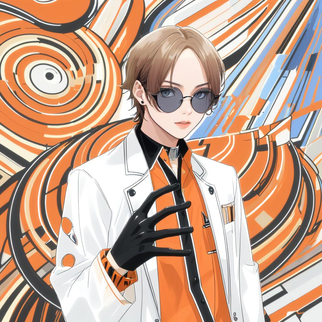 This digital anime-style drawing features a young man with short brown hair and fair skin. He wears round, dark sunglasses and a white lab coat over a black shirt with an orange tie. He also has black gloves. The background is an abstract, dynamic swirl of orange, white, and black patterns resembling a vortex or circular motion. The man's expression is calm, and he stands slightly to the right, with his right hand raised near his face. The art style is vibrant and modern, with bold lines and contrasting colors.