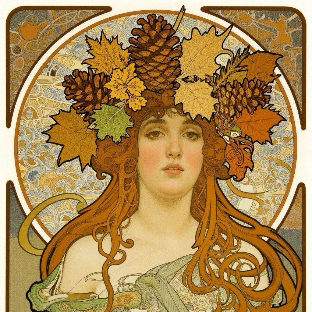 The image is a striking example of Art Nouveau style, characterized by its intricate and flowing lines, organic shapes, and a harmonious blend of nature and human elements. The central figure, a woman, is adorned with an elaborate headpiece that features a variety of leaves and pinecones, evoking a sense of autumn or nature's bounty. Her hair, styled in loose, curling tendrils, cascades down, blending seamlessly with the natural elements around her. The background is a rich tapestry of interwoven patterns and textures, adding depth and complexity to the composition. The color palette is warm and earthy, dominated by shades of brown, gold, and green, which enhance the naturalistic theme. The overall arrangement of the elements creates a balanced and visually engaging scene, with the woman's face and the headpiece serving as focal points that draw the viewer's eye through the intricate details of the artwork.