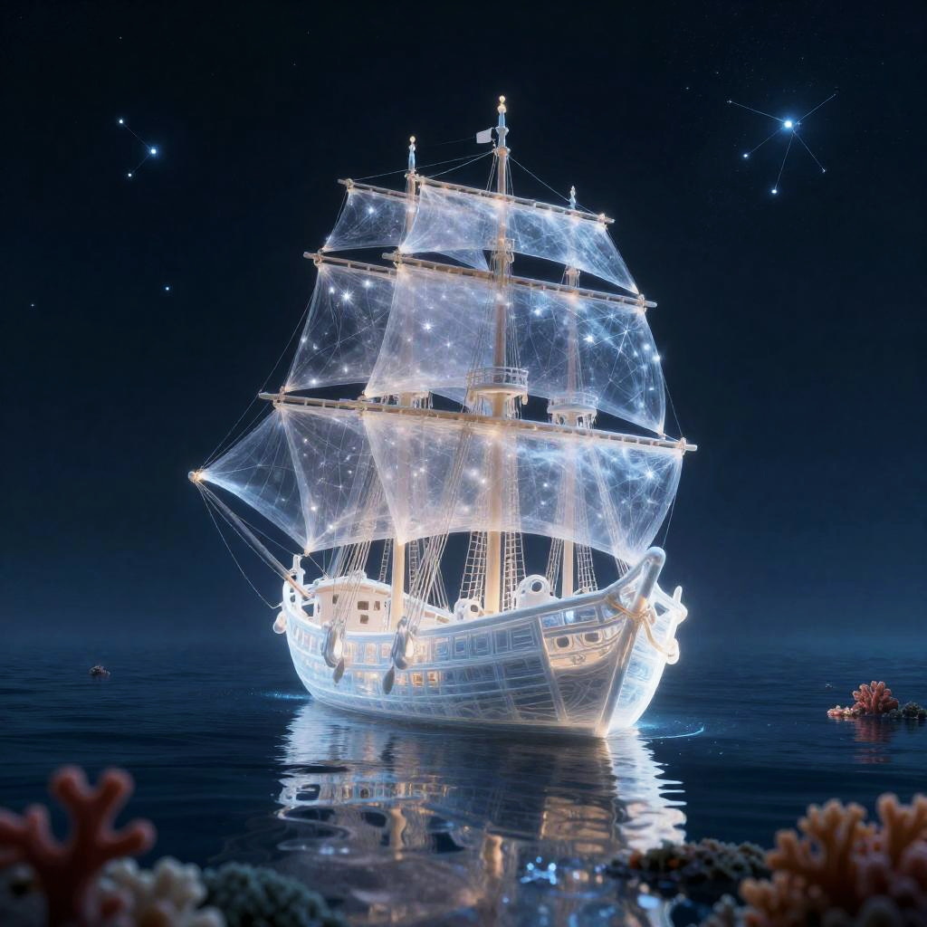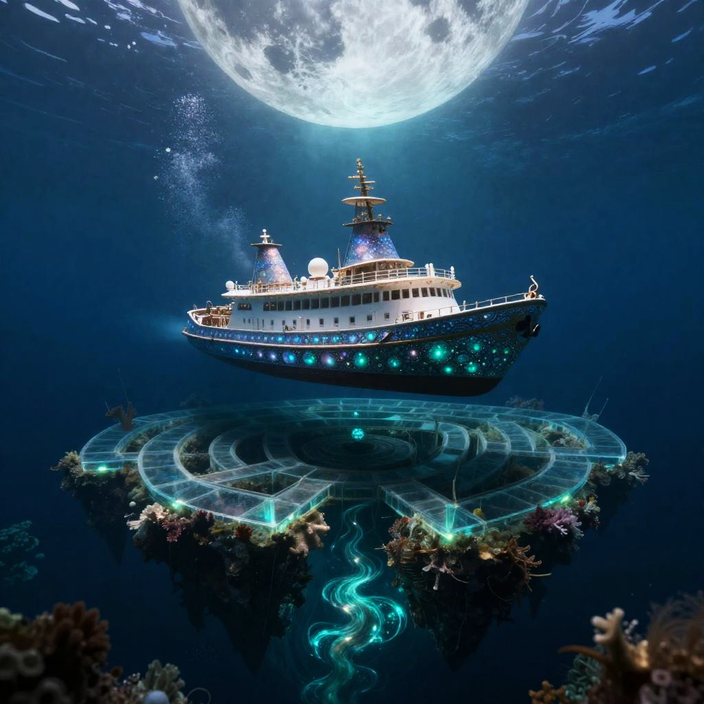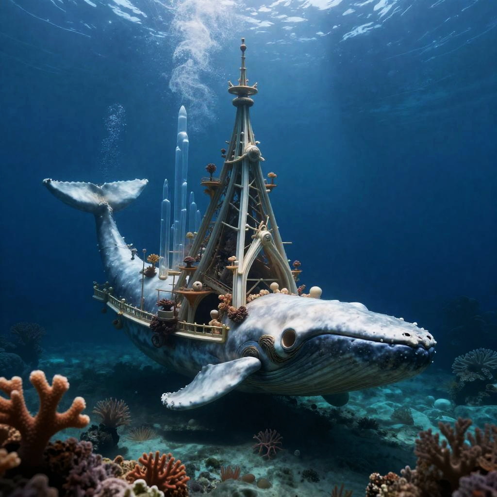 A bio-living cathedral ship grown from coral and whale bone exploring a luminous hydrothermal garden of glass spires and drifting vents, with wistful and cosmic. Highly detailed and surreal, evoking a sense of adventure and discovery.