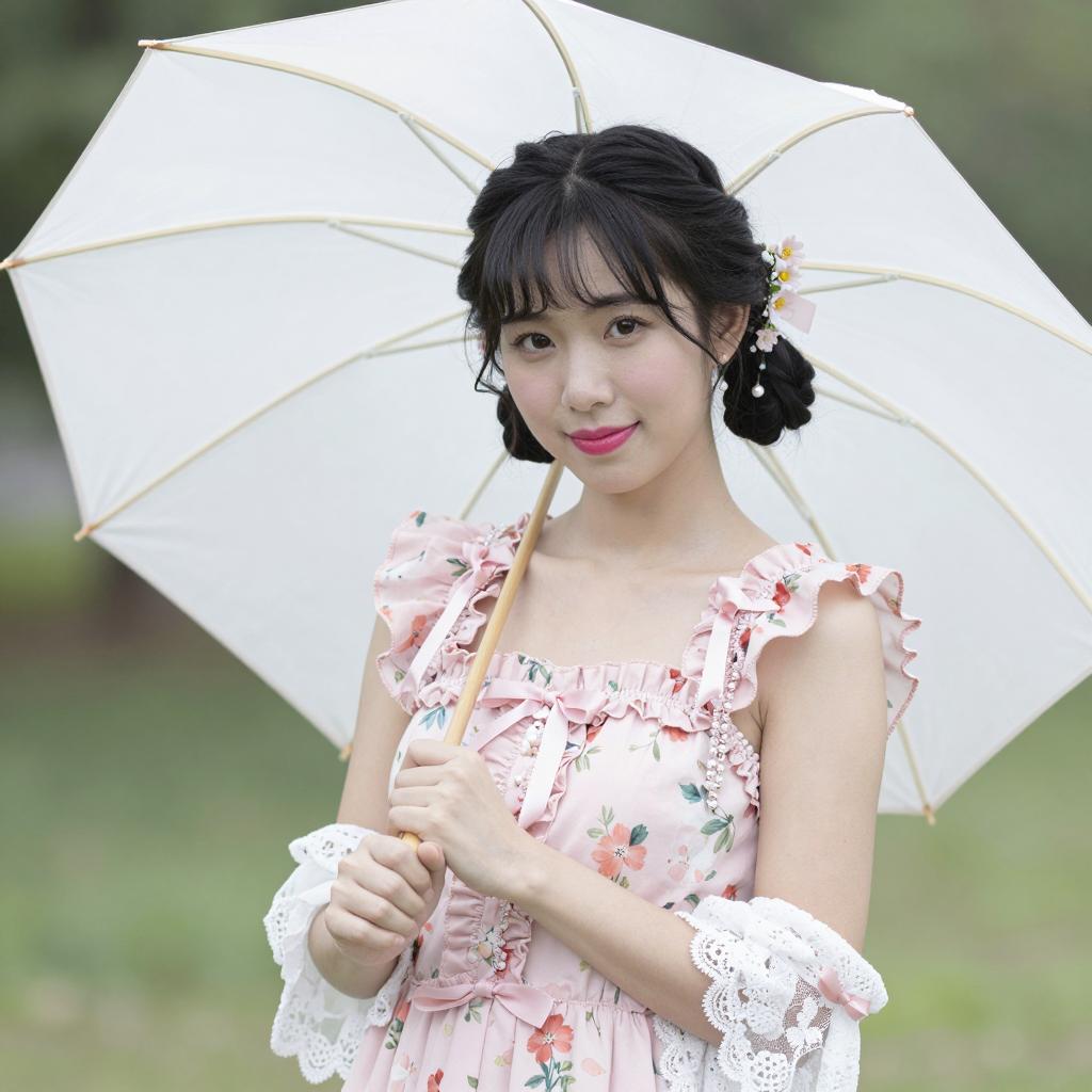 Asian woman with black hair in buns, wearing pink floral dress with ruffles, white lace sleeves, holding white parasol with pink ribbons. Floral hair accessories, pink lipstick, standing outdoors, green foliage background. Hands holding parasol, slight smile. Bright daylight.