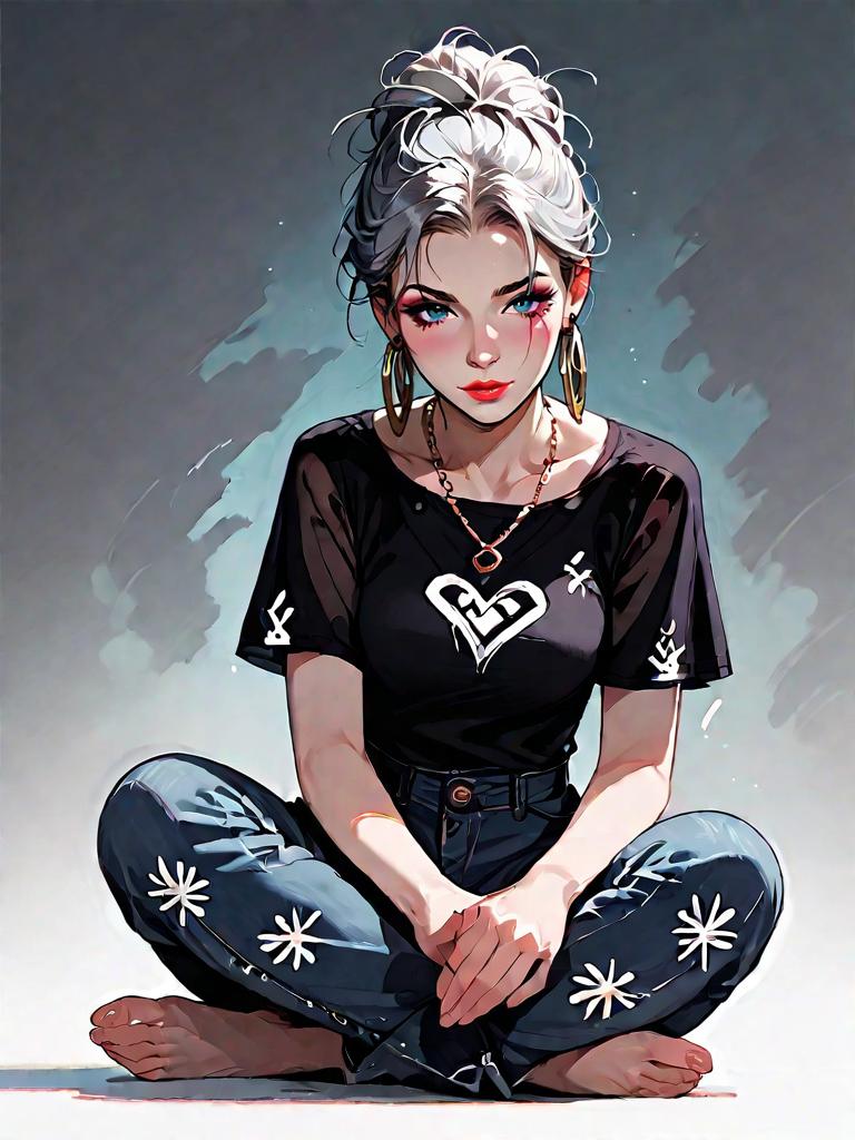1girl, source_comics, realistic face, full body shot, Woman, casual chic, fitted black top with short puff sleeves and sweetheart neckline, knotted detail at bust, high-waisted pants with gray and black animal print, flare silhouette, thin silver necklace, hoop earrings, hair styled in a half-up, half-down look, sitting pose, indoor setting with neutral colors.