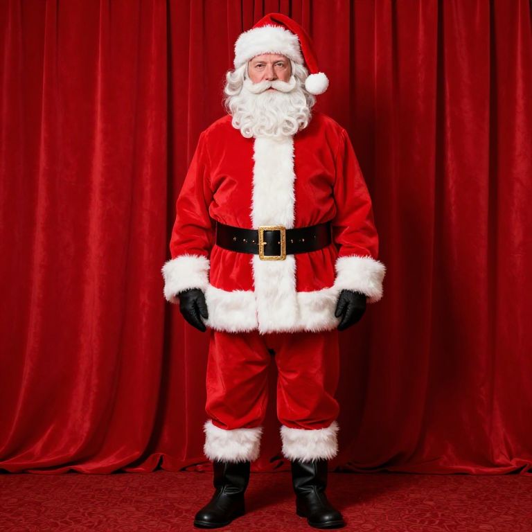 A full-body photo of a Santa Claus figure standing in front of a red curtain. He's wearing a bright red suit with white fur trim, black belt with gold buckle, black gloves, and black boots. He has a white beard and mustache, and a Santa hat with a white pom-pom. The floor has a red patterned carpet. His expression is calm and slightly serious.
