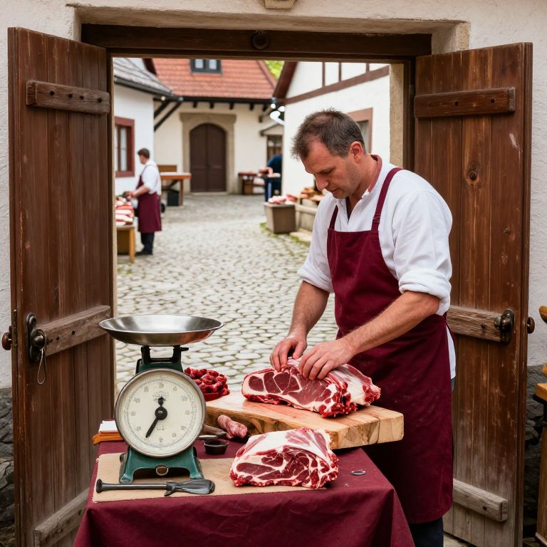 Butchers preparing meat in a traditional European village setting, cobblestone streets visible through open doors, vintage scales and tools on display, warm lighting highlighting rich reds and maroons of fresh meat, a timeless snapshot of artisanal craft and community life.