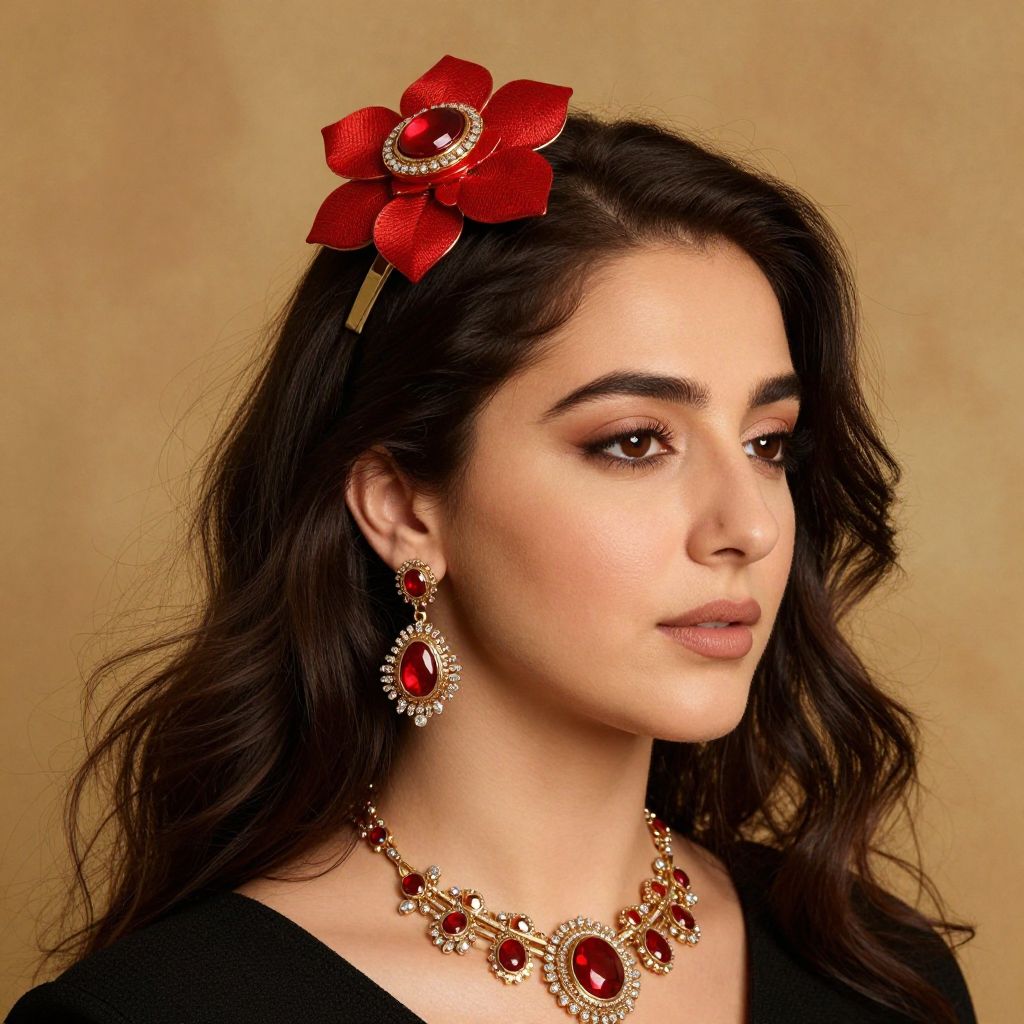 Farah Atassi's *Woman with Brooch* showcases a woman adorned with intricate jewelry, featuring a vibrant red brooch atop her dark, flowing hair, complemented by matching earrings and a detailed necklace, all set against a warm, textured background.