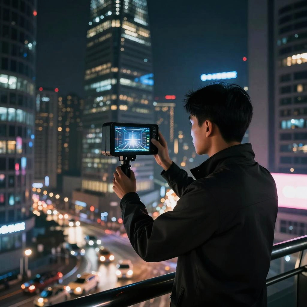 Photograph of an Asian man with short black hair, wearing a dark jacket, taking a photograph of a cityscape at night with a camera held in front of him. The background features illuminated skyscrapers and blurred city lights, including red and white lights from traffic below. The man is standing on a balcony, and the camera screen shows a bright, white-lit cityscape. The overall color palette includes dark blues, blacks, and bright whites from the city lights, creating a contrast between the subject and the bustling urban environment.