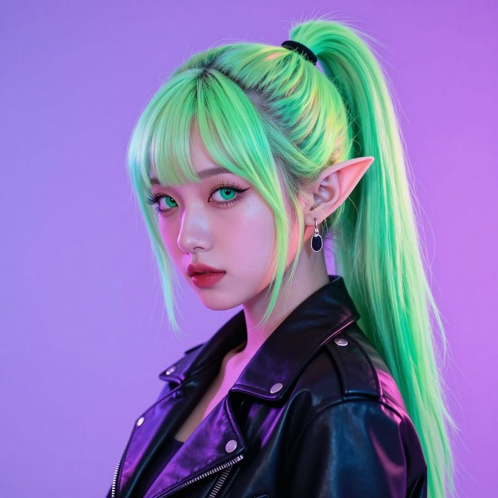 Neon, 1girl, elf, neon hair, neon eyes, ponytail hairstyle, black leather jacket