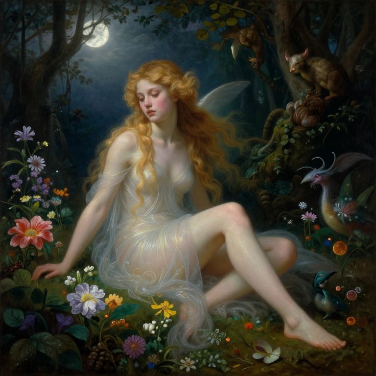 Craft an image reminiscent of Renaissance oil paintings, showcasing a delicate nymph with translucent skin and cascading golden locks bathed in soft moonlight. Capture her from a low angle as she sits pensively on a bed of vibrant flowers in a mystical forest clearing, exuding an emotional spectrum ranging from serene enchantment to introspective melancholy. The lush surroundings teem with otherworldly creatures and magical elements, enhancing the ethereal ambiance while accentuating the sublime grace and realism of the nymph's portrait.