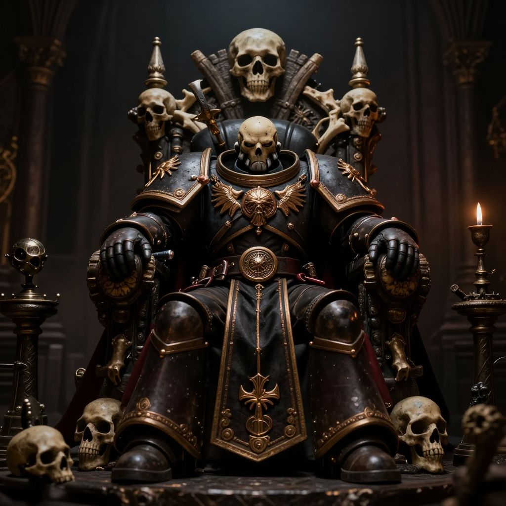 Photograph of a dark, gothic throne room featuring a menacing figure seated on an ornate black throne. The figure wears elaborate, black armor adorned with gold details and a large, winged emblem on the chest. Multiple skulls, both on the throne and surrounding the base, add a macabre touch. The figure's helmeted head is prominent, with an intimidating expression. Two lit candles flank the throne on the right, casting a warm glow. The background is dark and shadowy, emphasizing the throne's dramatic lighting. The overall style is gothic and dark fantasy.