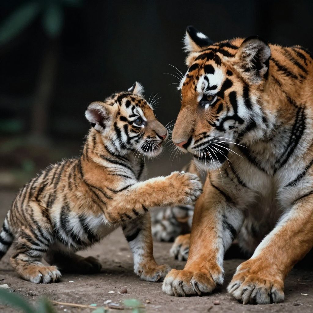 Photograph of a tiger cub reaching out to an adult tiger, both with vibrant orange and black striped fur, in a dark, forested background.