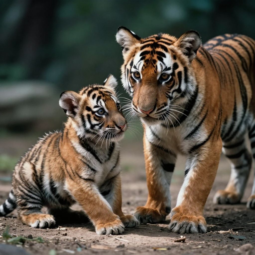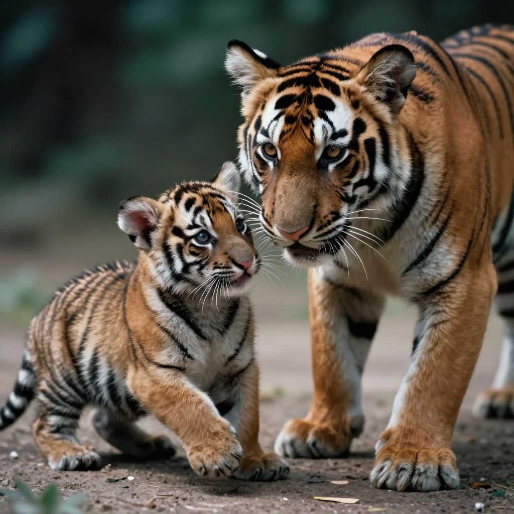 Photograph of a mother tiger and her tiger cub interacting closely. The cub, with its small, outstretched paw, reaches towards the larger, standing mother tiger. Both have vivid orange fur with black stripes and white underbellies. The cub's fur is slightly fluffier, while the mother's is more dense. The background is dark and blurred, highlighting the tigers. The ground is brown and slightly textured, with small green leaves scattered. The mother tiger's attentive gaze meets the cub's curious expression, capturing a tender moment in the wild.