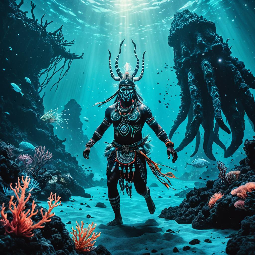 A tribal shaman with body paint swimming toward an enormous bioluminescent sea creature, surrounded by radiant plankton and underwater volcanic vents, painted in ethereal pastel illustration, dynamic and immersive