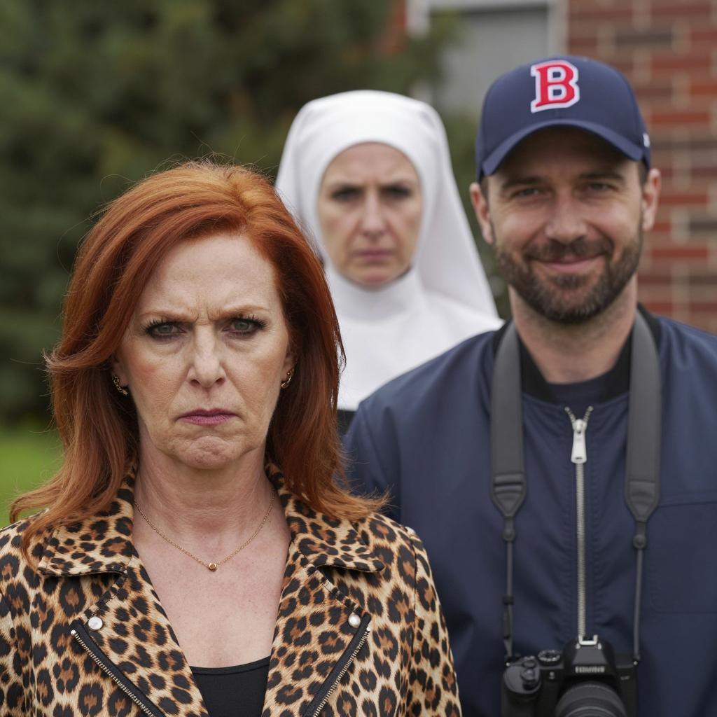 Photograph of two people in front of three football players. Woman with red hair, purple hat, teal blouse, green jacket, open mouth, hands raised. Man in blue jacket, black hat, pointing, surprised expression. Football players in red jerseys, helmets, blurred background.