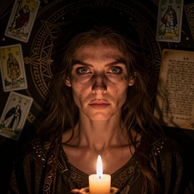 A superrealistic portrait of an enigmatic fortune teller with weathered skin and piercing eyes. She is illuminated by soft candlelight in a dim room. The viewer is subject to a direct gaze from above, conveying both wisdom and an air of mystery. Intricate patterns, tarot cards, and ancient texts fill the background, alluding to her extensive knowledge and creating an emotional gradient that ranges from intrigue to respect as your eyes move across the scene.