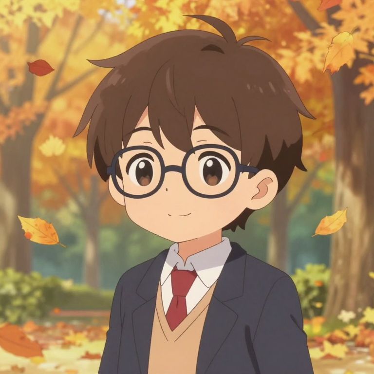 Anime-style drawing of a young boy with brown hair, glasses, and a school uniform, standing in an autumn forest with falling leaves.