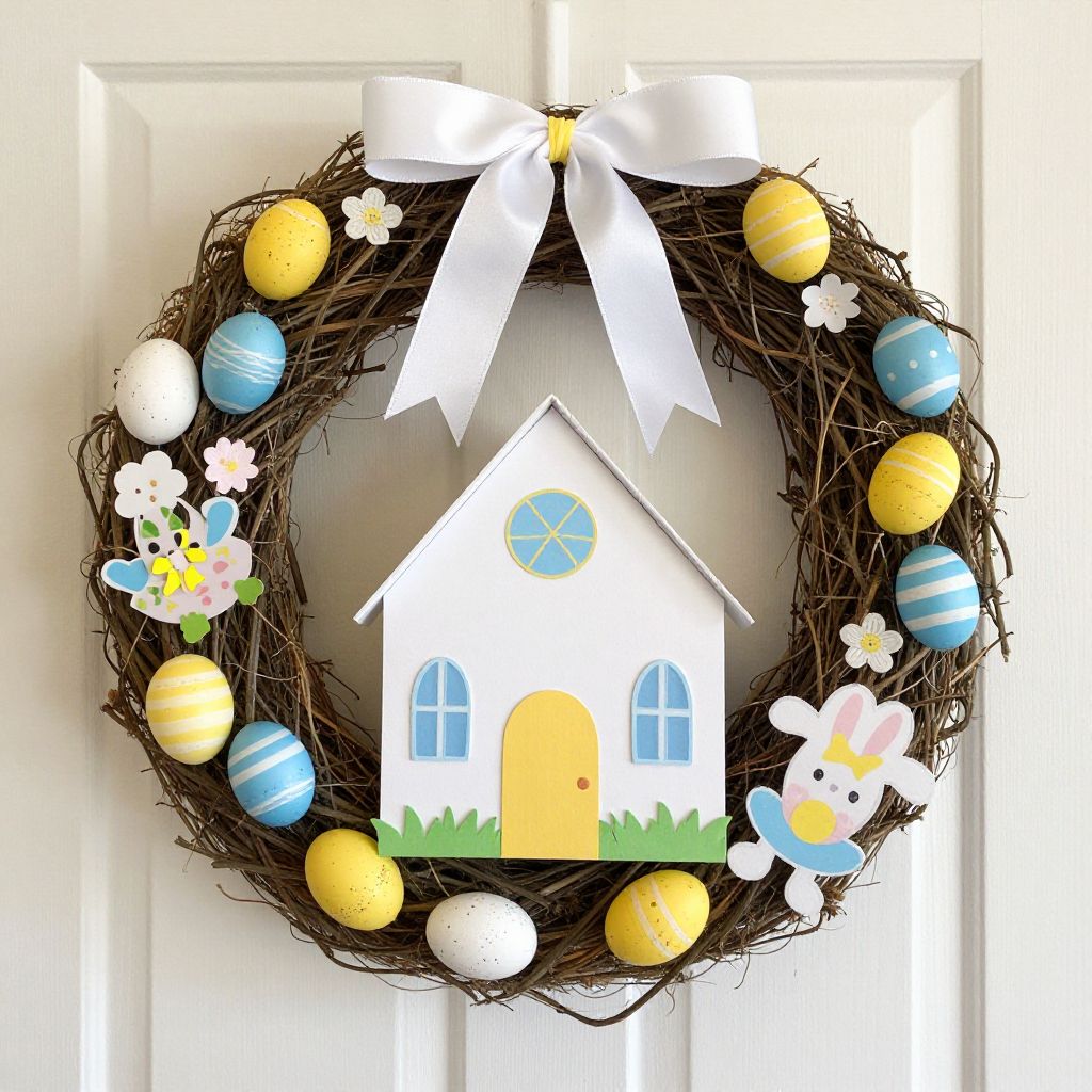 Easter wreath with yellow and blue eggs, white bow, small house, bunny, flowers, and a white door background.