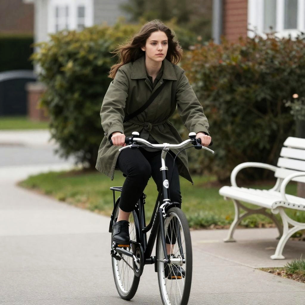 Blonde woman with light skin, yellow t-shirt, blue skirt, red backpack, riding bicycle on sunlit path. Green trees, shadows. She looks ahead with serious expression. Front view, holding handlebars, slight lean forward. Path in background. Daylight.