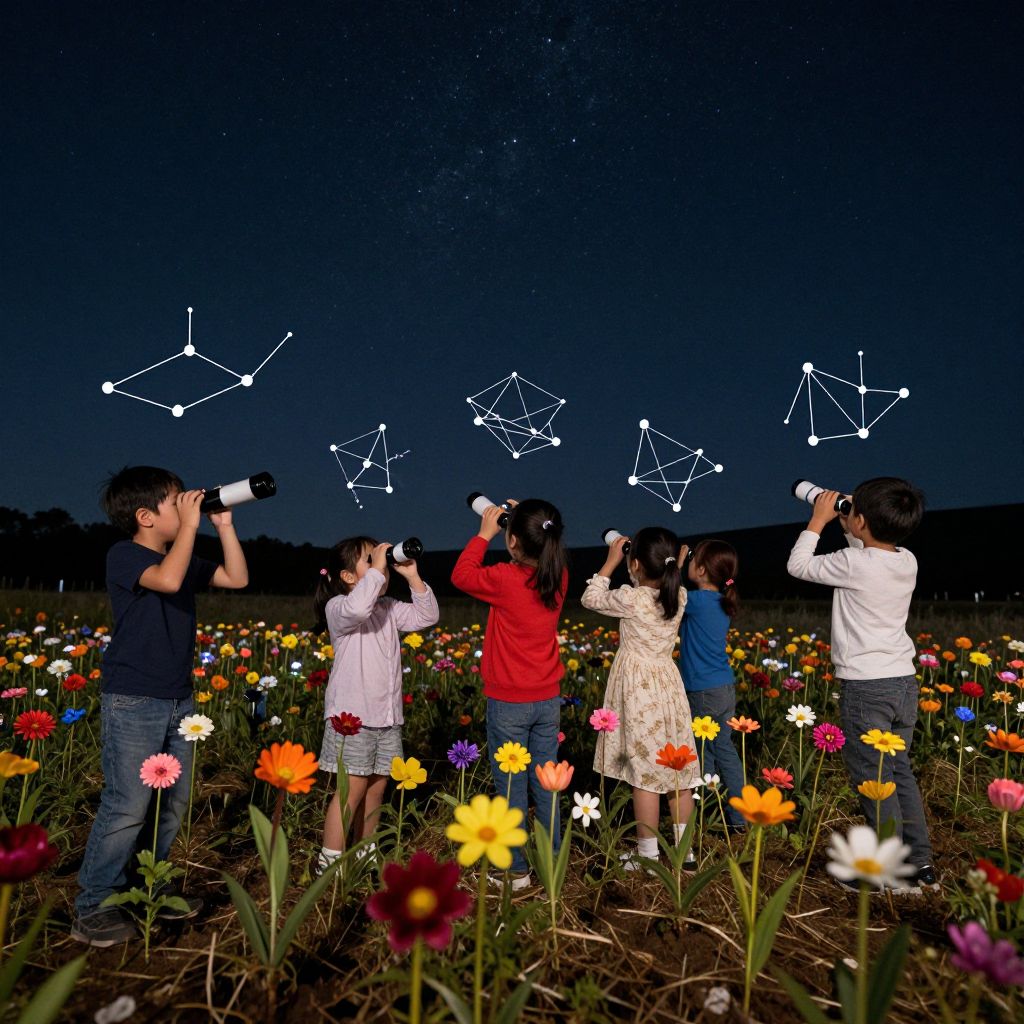 Children peer through telescopes into a starlit night, conjuring vibrant flowers that sprout from the ground, each bloom mirroring the geometric constellations they observe above.