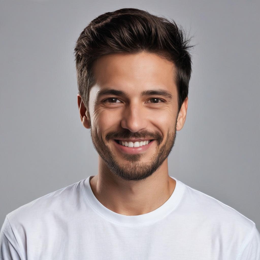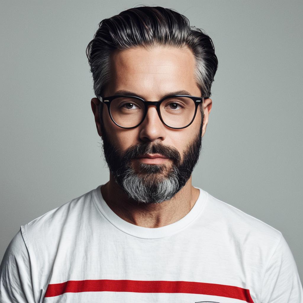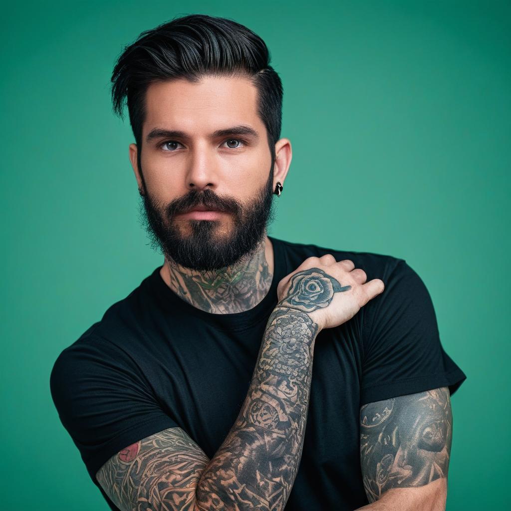 Facial hair, beard, 1boy, male focus, tattoo, solo, black hair, arm tattoo, looking at viewer, realistic, black shirt, shirt, blue eyes, short hair, mature male, upper body, stubble, parted lips, green background, portrait, mustache stubble
