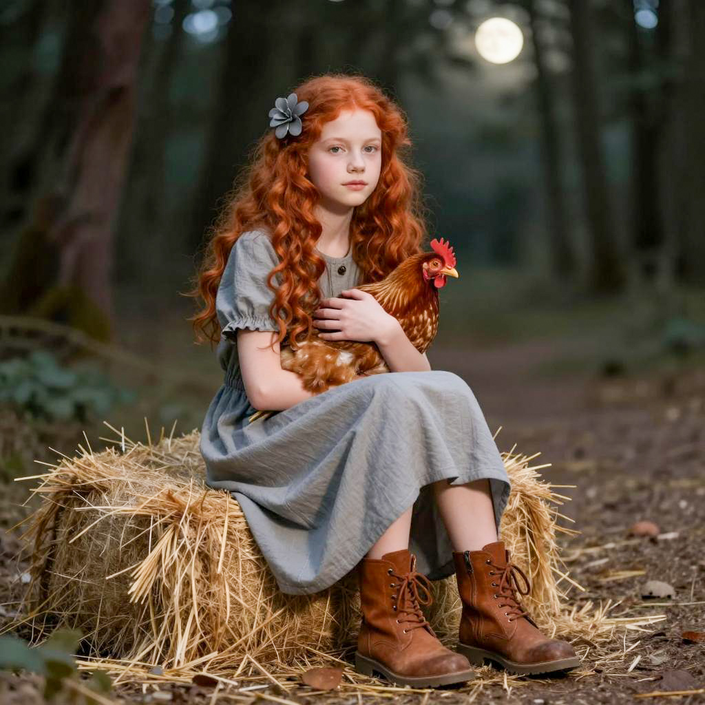 Red-haired girl with wavy hair, wearing gray dress and brown boots, sits on hay bale holding a small chicken. Dark forest background. Her face has a calm expression. One gray flower in her hair. Moonlight illuminates her. Dusty path beneath. She sits with knees together, arms wrapped around chicken.