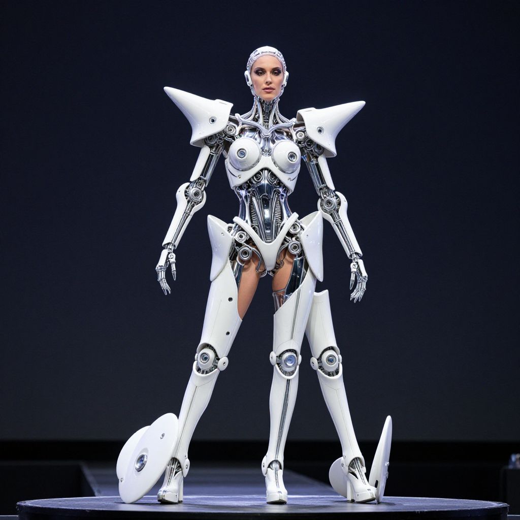 A digital CGI image of a sleek, futuristic female humanoid robot standing on a dark stage. She has a white, metallic, segmented body with angular, armor-like shoulder plates and high-heeled boots. Her chest area has circular, breast-like structures, and her limbs are articulated with visible joints. She has a bald head and a serious expression. On the ground to her left, there is a detached white helmet. The background is a gradient of dark blue to black, emphasizing her bright, white, futuristic design. The lighting highlights her metallic texture and intricate mechanical details.